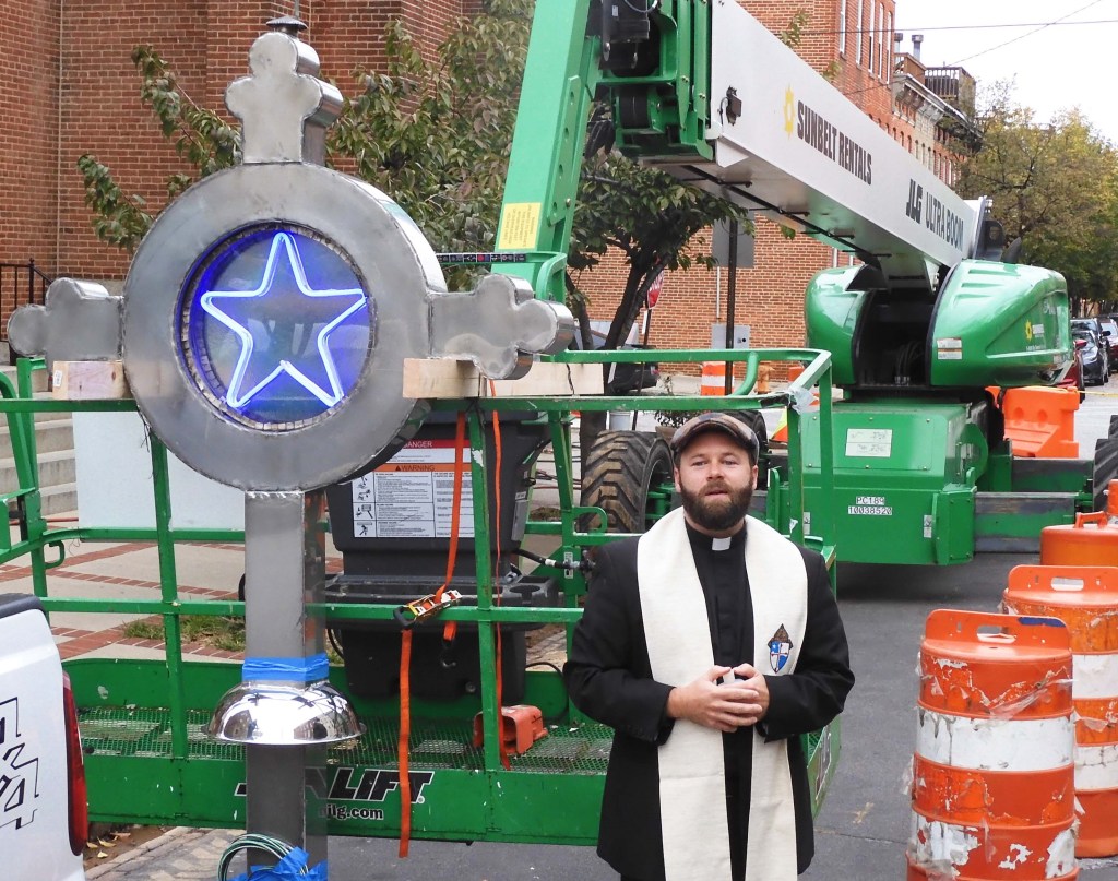Father Josh Laws, pastor of the Catholic Community of South Baltimore, blessed the cross and offered a short prayer to a crowd gathered on the street. “At seeing this cross and this star may all those who are lost, who are wandering, who feel rejected, know that they are not alone. They are loved, welcomed, and they can call this church their home,” Laws said.
