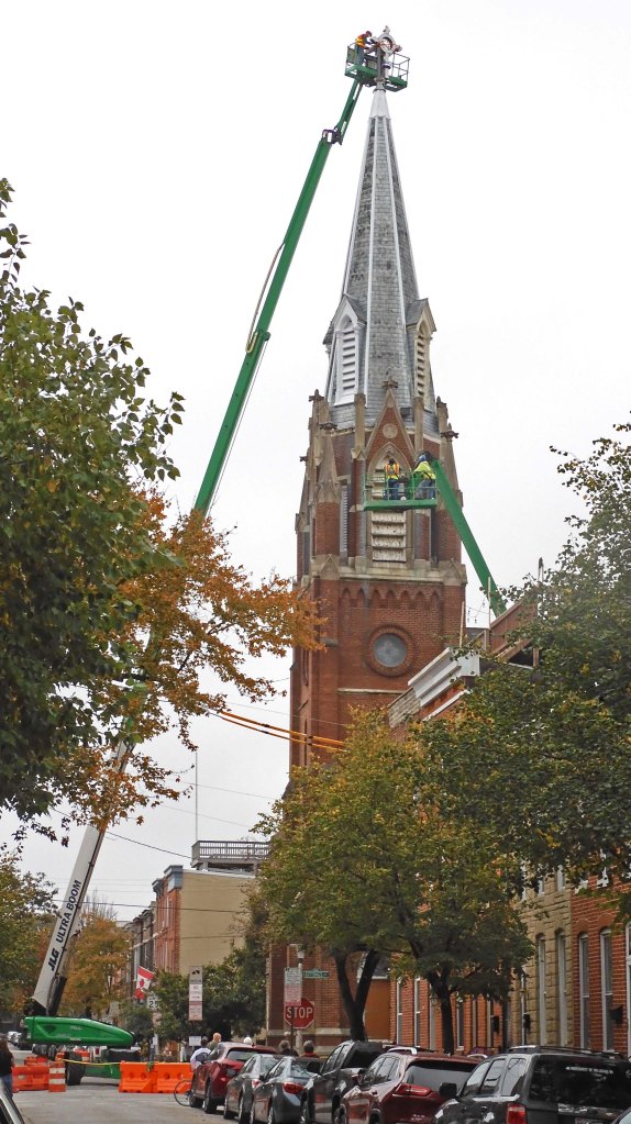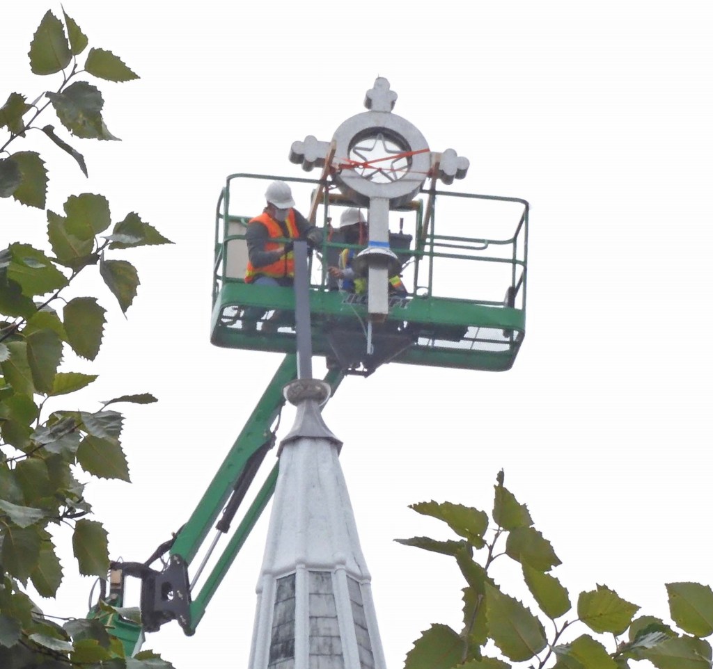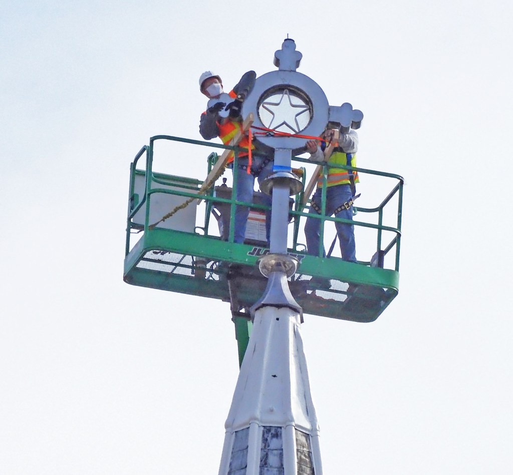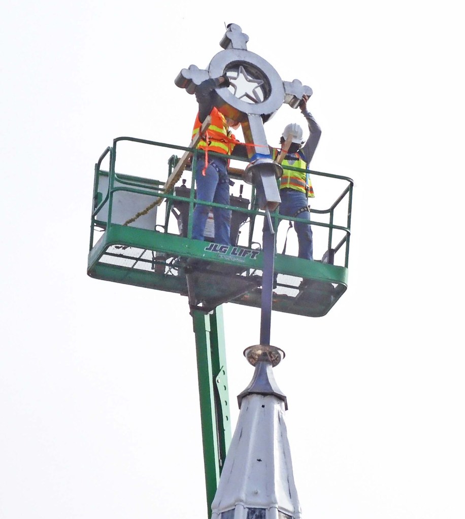 In just over one hour this morning (Oct. 20), a new lighted ‘star-cross’ was installed atop the steeple of St. Mary Star of the Sea church on Riverside Ave., visible once again across much of the peninsula. The previous star was damaged during a storm in April and removed from the steeple.