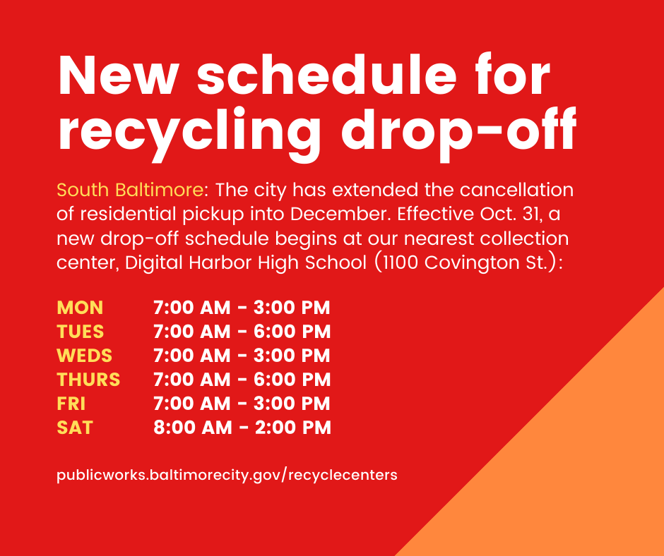 Residents remain responsible for recycling drop-off for at least another month, according to the city in an Oct. 27 announcement that extended the cancellation of residential pick-up until December (date TBD). The good news is that you can now drop off your recycling on Saturdays at the temporary community recycling centers. Our area’s closest center continues to be the city truck parked at the entrance to the Digital Harbor High School parking lot at 1100 Covington St. (Pro tip: Only leave your recycling at the center if there is a truck there for you to put it in.)
