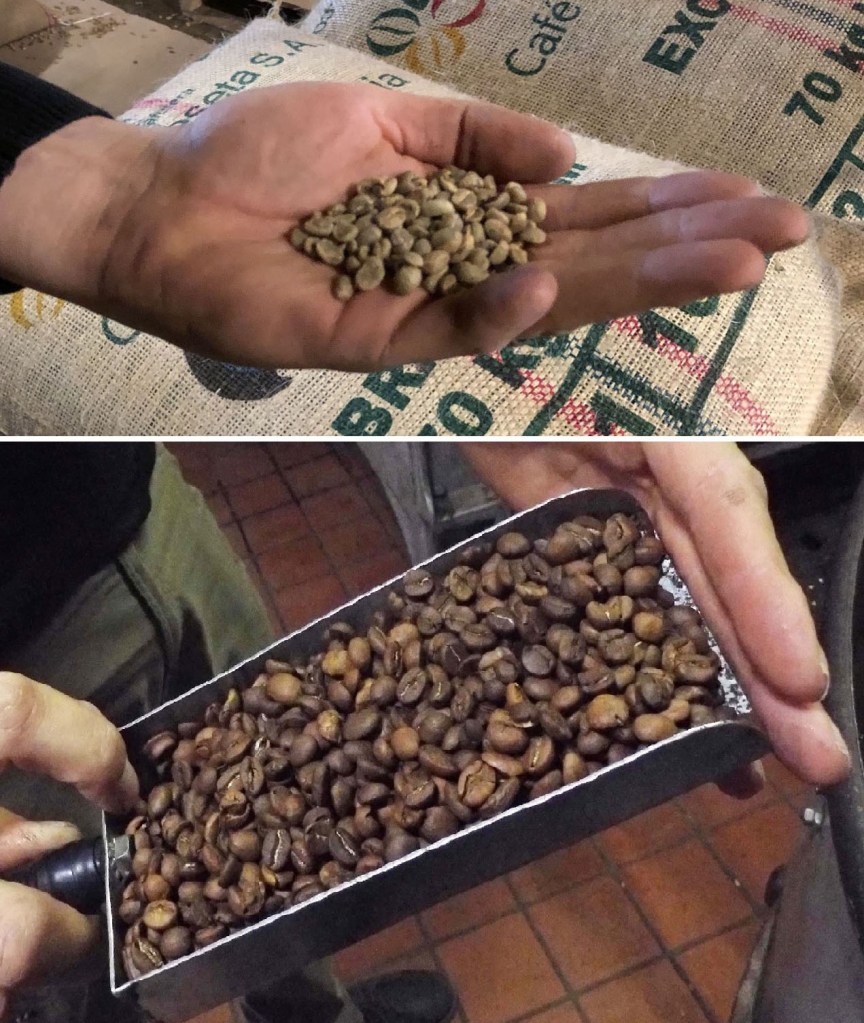 With the flick of a switch, Chris turns on the massive roaster. The temperature gradually rises to 400 degrees as the coffee tumbles round and round inside for 20 minutes. It’s a one-person operation, but Chris is fully engaged: eyes, nose, and ears. He periodically scoops beans out of the roaster and holds them to his nose to judge how the roasting is progressing. Near the end of the process, he listens for a distinctive cracking sound as the beans expand in the heat.