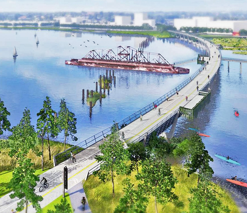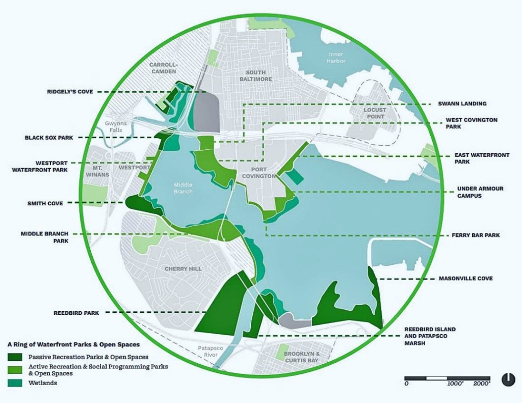 Over a decade in the making, the plan envisions a network of parks, recreational facilities, trails, and bridges that connect the 19 neighborhoods surrounding the Middle Branch of the Patapsco River with each other and with an improved “living shoreline” of wetlands and green space. A 20-year timeline is envisioned to complete the major elements of the plan.