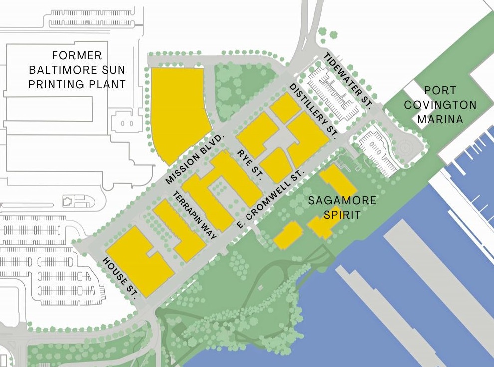 The new neighborhood covers a fraction of the former Port Covington industrial and commercial area slated for redevelopment. Major construction is still underway on the other side of E. Cromwell Street between Nick’s Fish House and Sagamore Spirit distillery. The new Under Armour headquarters complex is rising, and the Locke Insulator factory is being cleared away to make room for hundreds of new homes by a separate developer. No plans have been released for the rest of the property, which extends west across Hanover Street.