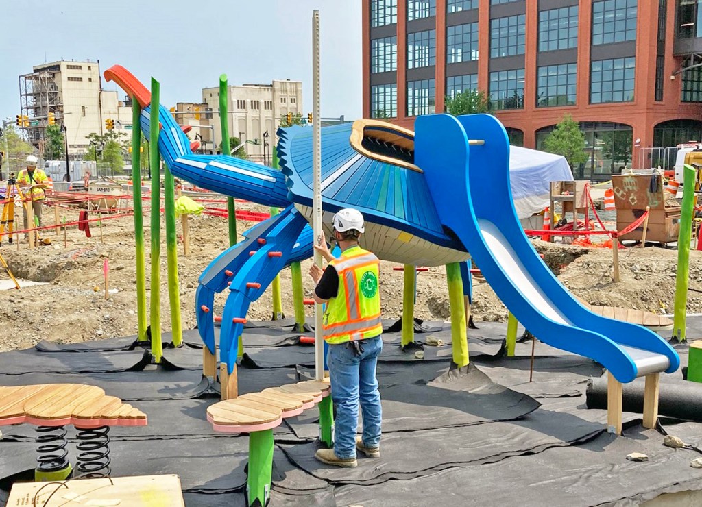 The northeast side of this corner is still a construction zone, fenced off to traffic and pedestrians. An as-yet unnamed city park is being built here on top of an underground wastewater storage tank designed to ease the new development’s impact on the city’s public works infrastructure. Landscaping is underway as well as installation of playground equipment, including an eight-foot-tall, climbable blue crab.