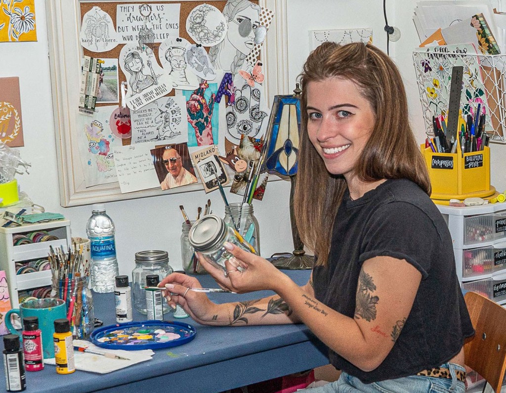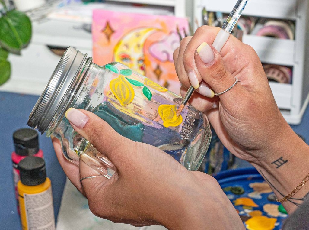 Alexa’s creative process starts with a canvas or object, even something as simple as a mason jar. She sets up in her studio and begins painting, using special paints if the object is glass or fabric. She’ll paint flowers, butterflies, or calligraphy on the object and set it aside to dry while she works on others. Depending on the size and material of the item, an order can take anywhere from 30 minutes to two hours when factoring in drying time. She purchases her supplies from local stores and retail chains such as Michaels and A.C. Moore Arts and Crafts as well as online suppliers such as Amazon, VistaPrint, and Sticker Mule.