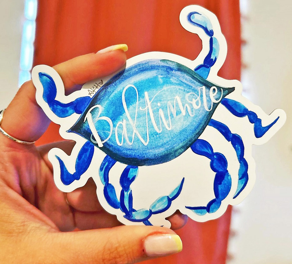 She premiered a new Maryland-themed design – a blue crab – at “I Love SoBo Day” that was praised by SoBohemians, she says. The crab car magnet sold out in less than a week; branded koozies have also been very popular. Alexa has recently started to paint more Baltimore- and Maryland-pride themed items. Seasonal products like Christmas tree ornaments are popular during the holidays. Some of her bestsellers on Esty are stickers and postcards, which she can order in bulk from Sticker Mule.
