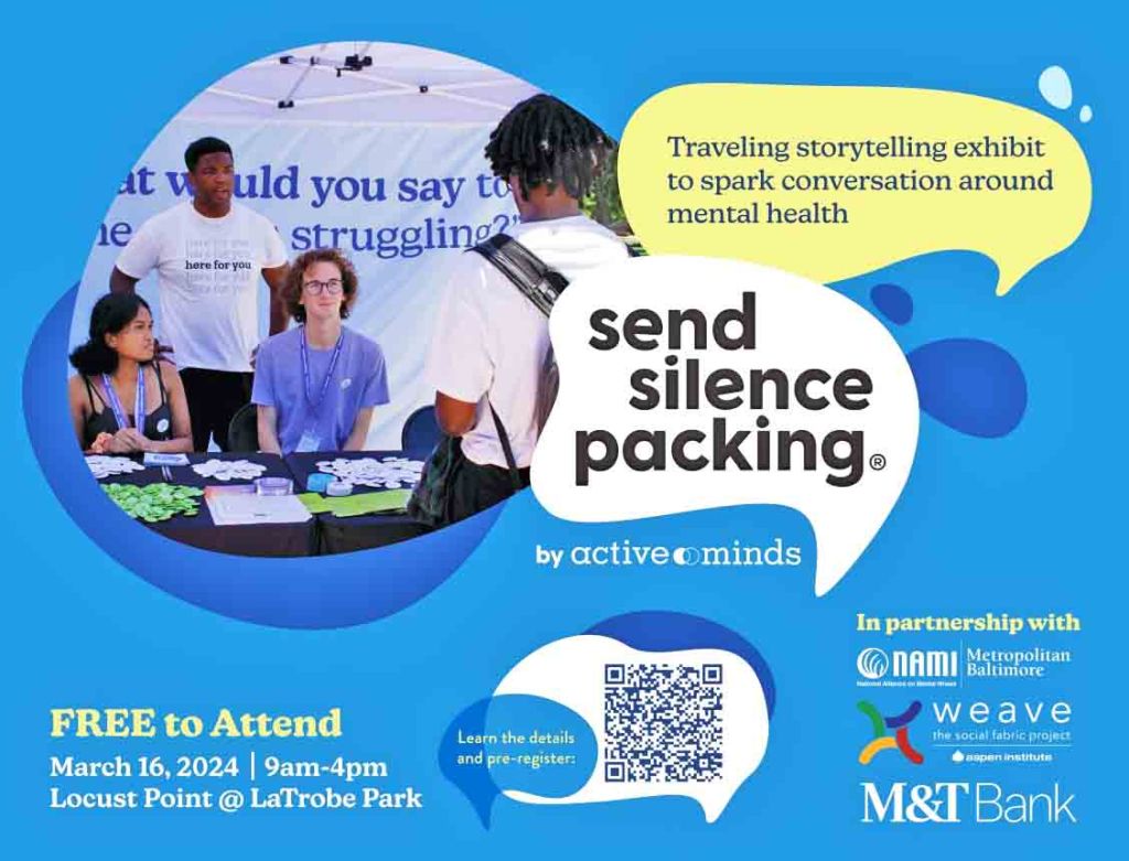 The centerpiece of the Latrobe Park event will be a traveling exhibit from Active Minds called “Send Silence Packing.” The interactive exhibit highlights stories of people who have lost loved ones to suicide as well as stories of suicide-attempt survivors. The stories can be experienced by reading words affixed to individual bookbags or listening to audio recordings. The event will also feature booths with mental health resources and local vendors offering wellness services and products, Sartori said.