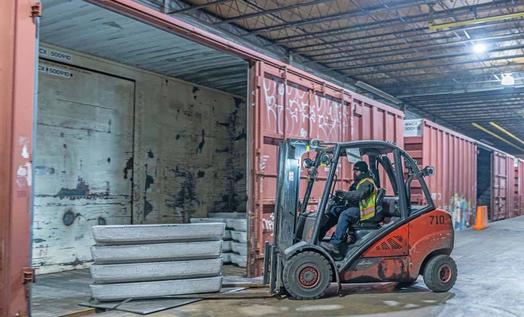 Storage facilities on both sides of Fort Avenue include warehouses for sensitive materials and open-air storage for ingots of aluminum. The cargos are unloaded by the ships’ own cranes at their south side berth or by Steinweg’s two 180-foot tall, 35-ton electrically operated cranes at North Locust Point Pier 1. The cargo is stowed in extensive storage facilities before being shipped out by rail or truck.