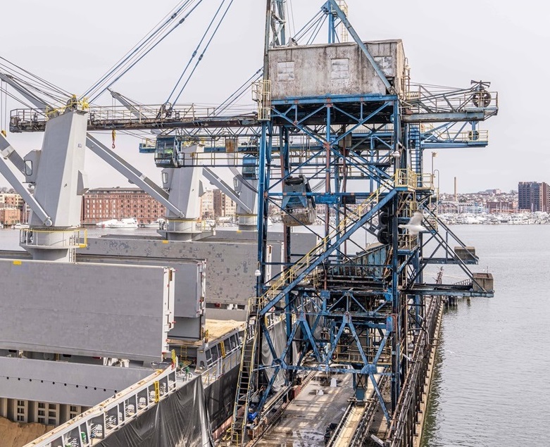 Probably the most visible Locust Point import for SoBo residents is salt – mountains of it – rising along the north side of E. Fort Avenue, just before you reach Fort McHenry. Beyond those mountains, you can see the North Locust Point Terminal’s finger piers and accompanying warehouse sheds, operated by the Maryland Port Administration. The salt used on the state’s highways is the largest cargo unloaded here. Paper products, wood pulp, lumber, latex, steel, and other containerized products are also moved through this terminal. These cargoes are unloaded with one container crane and two 75-ton gantry cranes.