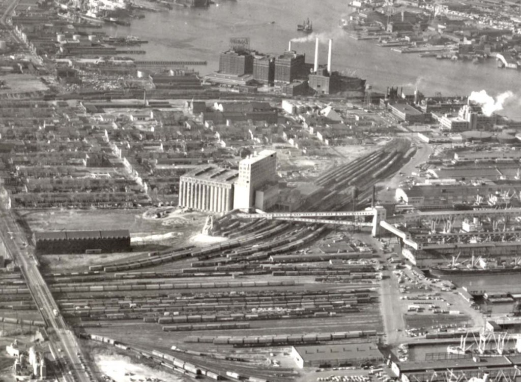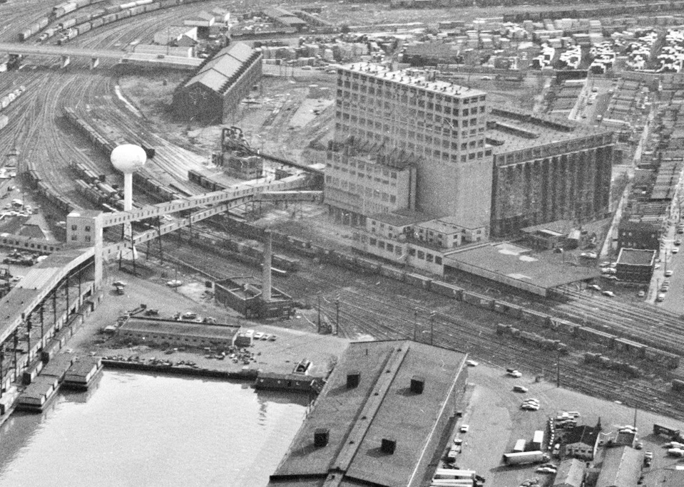 A grain elevator is a specialized warehouse and machinery complex, elevated above the adjacent piers so that grain flows by gravity into a ship’s hold for export. Bulk products like grain came by rail to warehouses and transfer facilities on the waterfront, each specialized to handle large volumes of specific products, including tobacco, grain, and coal for export and imported sugar and coffee.