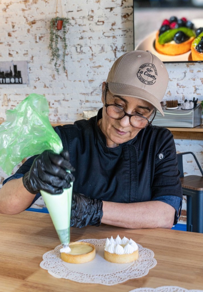 Chef Ahlem Kechrid stands in her tiny kitchen at the back of the La Cosette French Artisan Pastry Shop on a warm spring morning on E. Fort Avenue. A small woman with big energy and a strong sense of creative purpose, the chef is working with an array of pastries on the neatly arranged surface in front of her. She is surrounded by packed shelves of colorful ingredients in glass jars, bins, and boxes: flours, sugars, nuts, berries, seasonings, and spices.