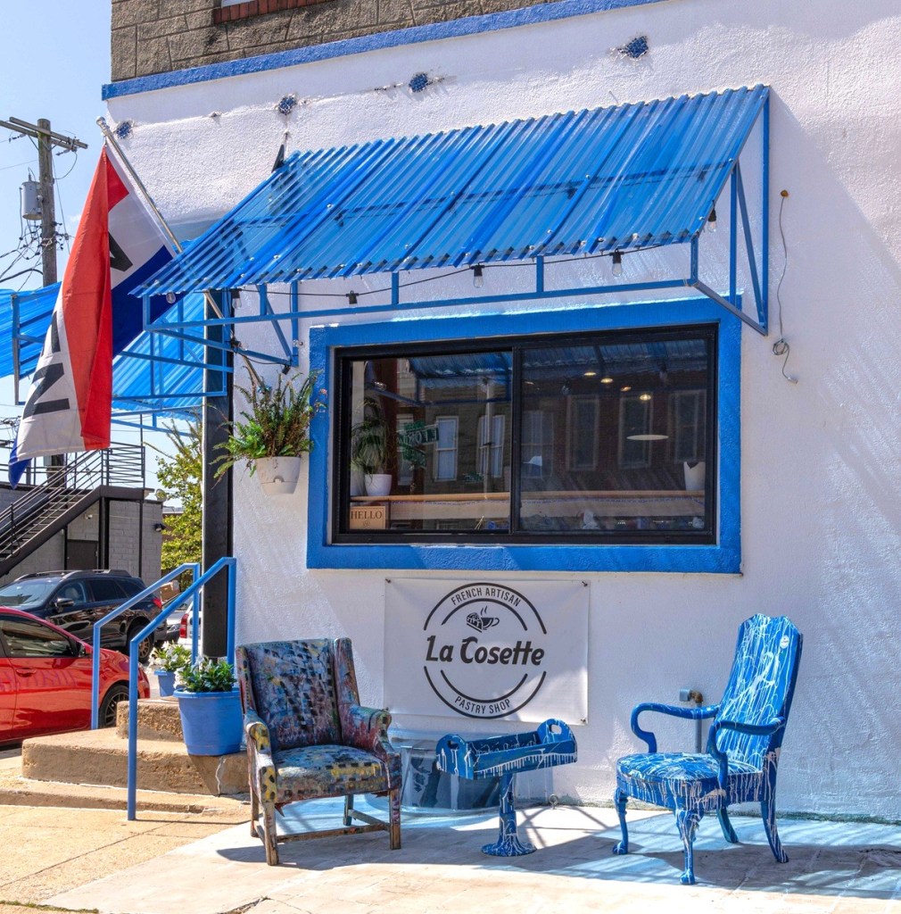 La Cosette occupies the first floor of a rowhouse on the corner of E. Fort and Boyle Street, painted white with bright blue trim and awnings. It’s the same spot that housed the popular Baba’s Mediterranean Kitchen for nearly 15 years. The hand-chalked sign on the street out front reads “Bonjour, Beautiful People.” Walking in the front door casts visitors into the atmosphere of a traditional French patisserie, with Parisian bal musette playing in the background. Paintings by local artists decorate the walls.
